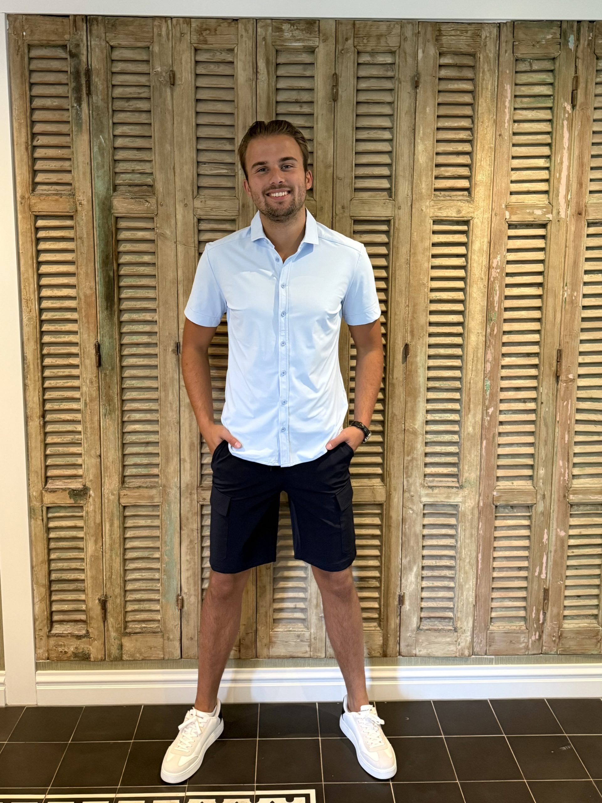 Deze cargo short van travelstof is gemaakt voor mannen die comfort én stijl willen – zonder gedoe. De soepele, ademende en strijkvrije travelstof is al lang een favoriet bij onze heren, en nu ook beschikbaar in deze robuuste, korte broek. Dankzij de sportieve snit, stevige cargozakken en stretchy stof zit ’ie als gegoten en beweegt hij makkelijk met je mee. Ideaal voor een actieve dag, een relaxte weekendlook of op vakantie. Combineer ‘m met een travelstof overhemd voor een krachtige, casual outfit.